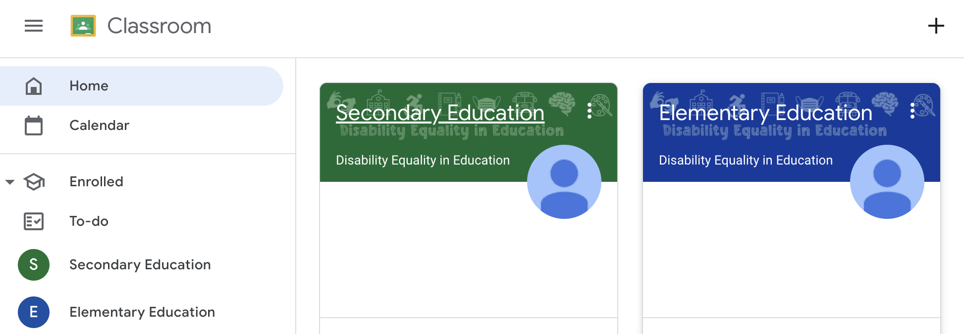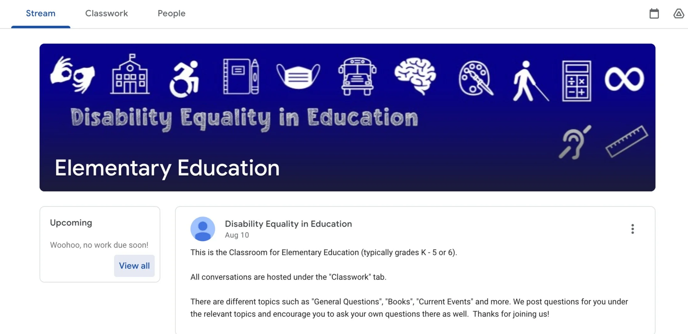 Once you’ve joined the class using the link that was on the Educator Membership Homepage (if you don’t know how to find that, contact us at info@DisabilityEqualityEducation.org or your school administrator), you will have access to the Google Classroom.