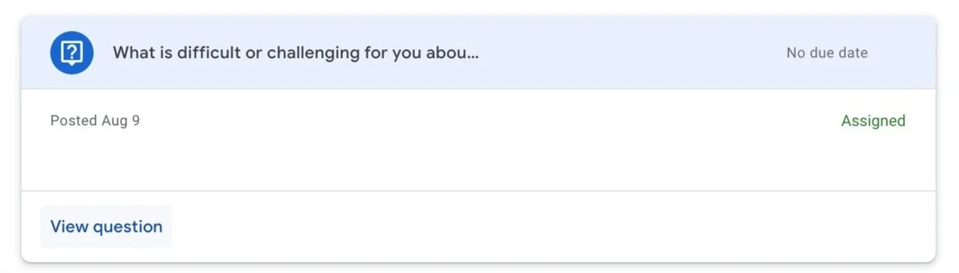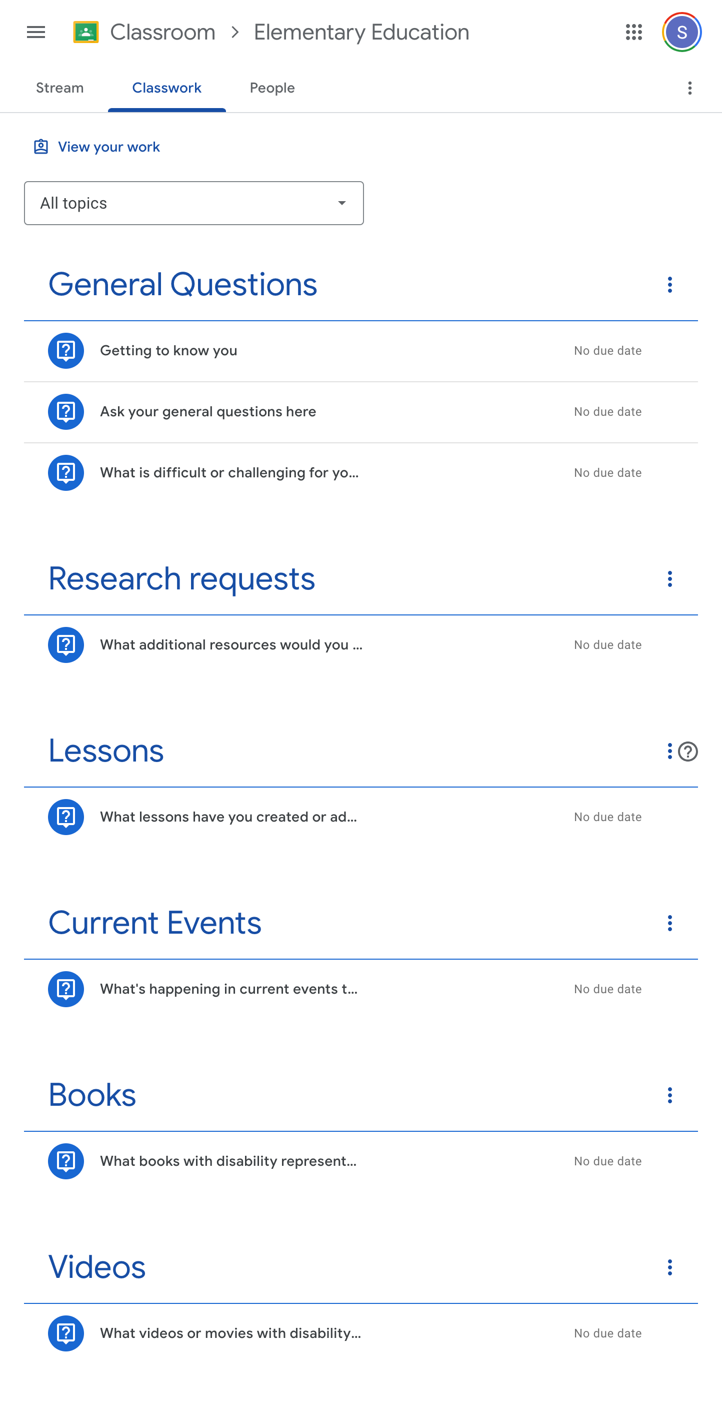 Under “Stream” you will see all of the topics listed with individual questions or prompts nestled under them. Because this is not a traditional classroom, there are no grades or due dates. When there are too many questions or topics to see comfortably, you can use the drop-down filter that by default says “All topics” to select just one topic to view at a time.